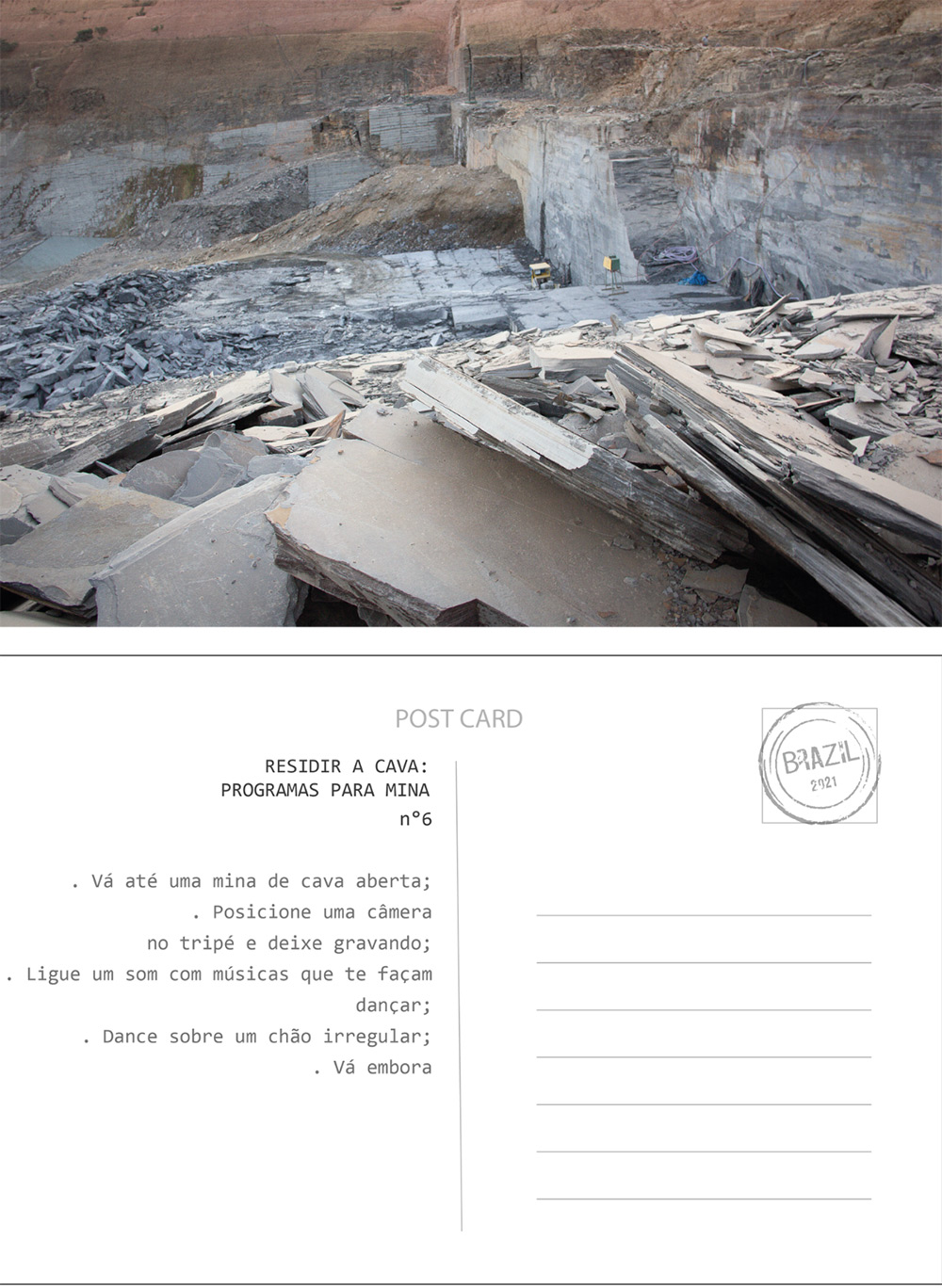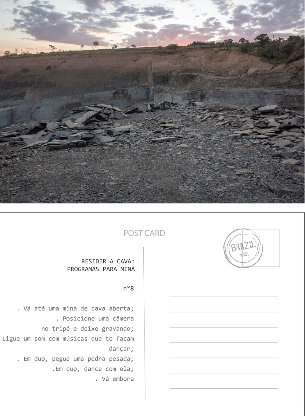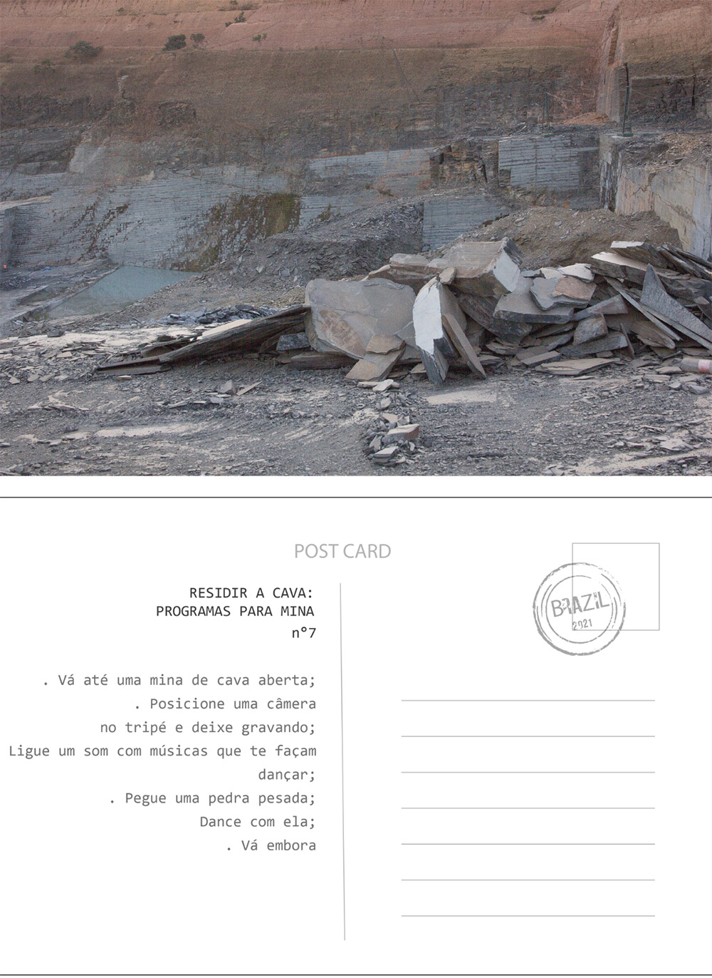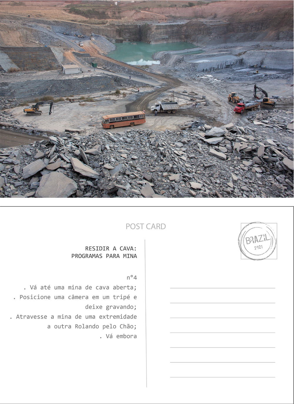 Essa vivência, também desembocou em trabalhos anteriores ao projeto Residir a cava, são eles: A fotografia “Uma estrela que pisca” (2014); A performance Lisêncio (2017) – desempenhada dentro da programação do “perfura_ateliê de performance” no SESC Palladium (Belo Horizonte, MG) e no Confluências Festival de Arte Contemporânea” (Argentina/Paraguai).