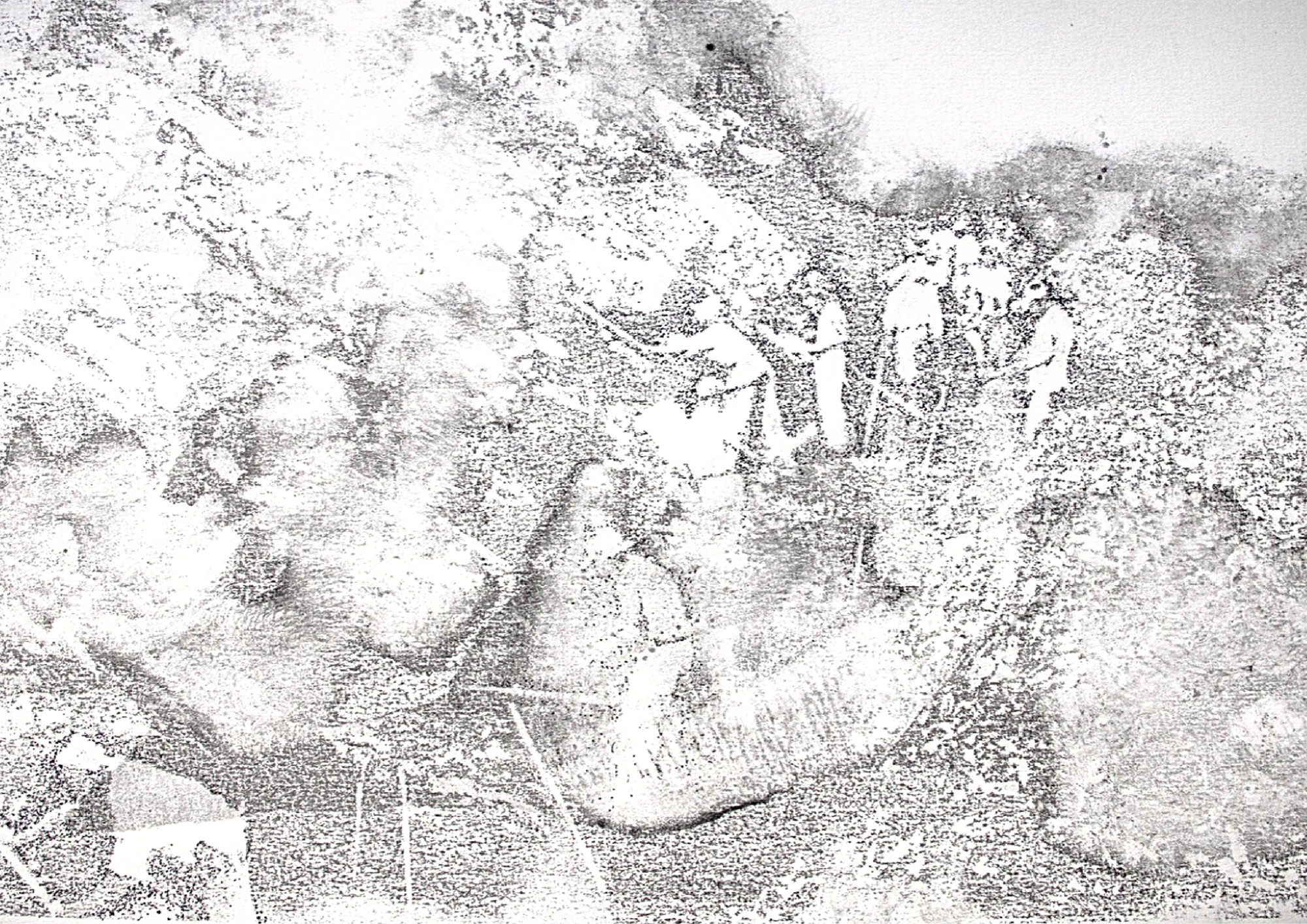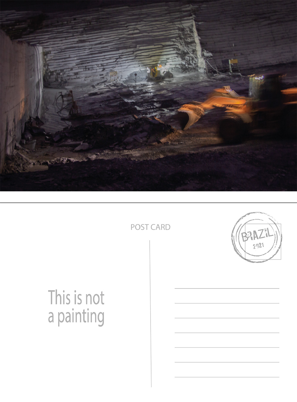 A relação de seu corpo com o buraco, com os fragmentos dos chãos, seu brilho, sua poeira, o silêncio ruidoso ininterrupto, os tremores, os estrondos, as botas pesadas, o glamour decadente dos concursos de beleza “Rainha do minério”, e a desproporção – “Torção desmedida da paisagem”, nas palavras de Wisnik.